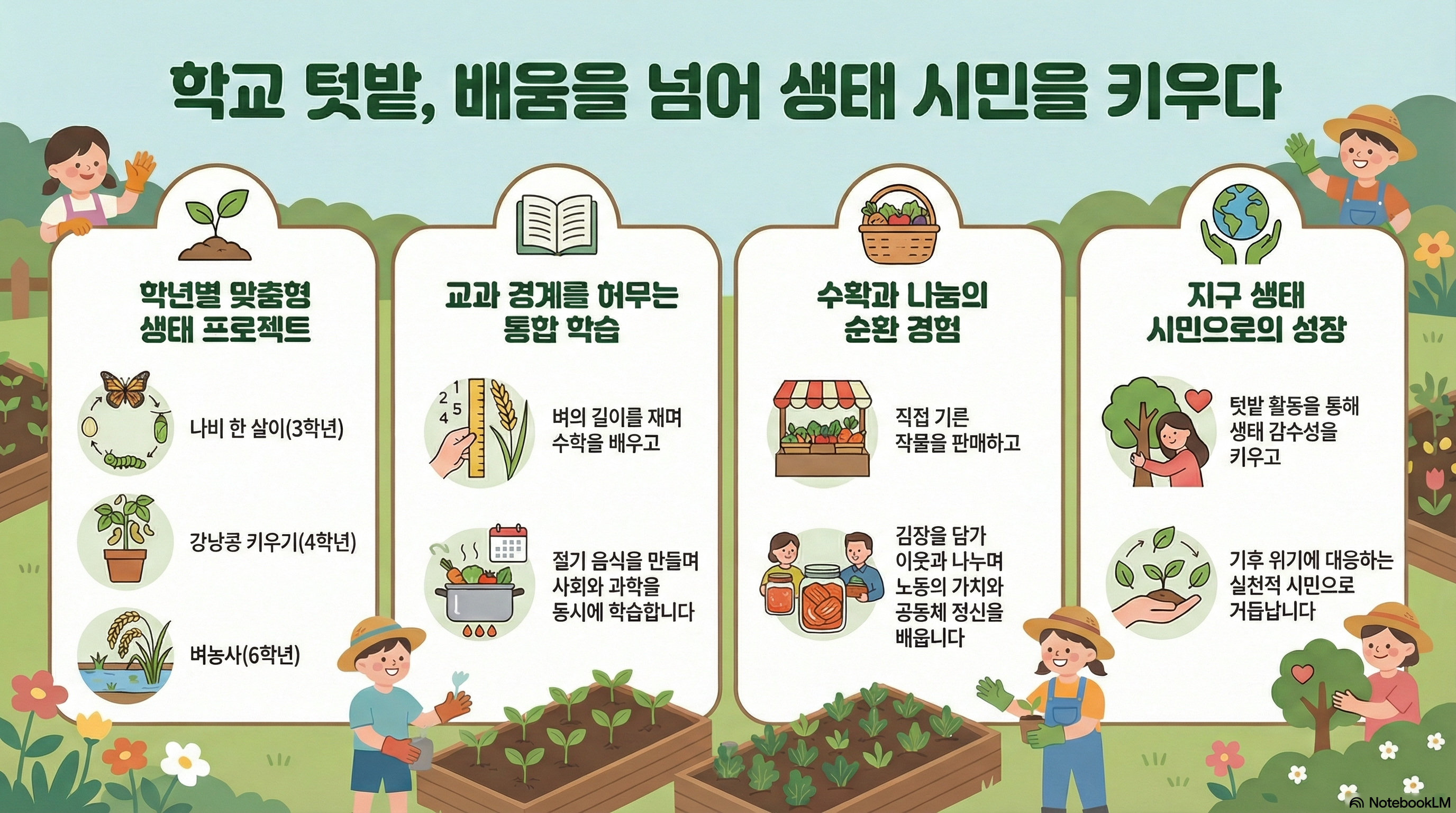 이처럼 텃밭 교육은 학년별 교육 과정과 긴밀하게 위계성을 갖고 연결될 때 진정한 교육적 힘을 발휘합니다.
